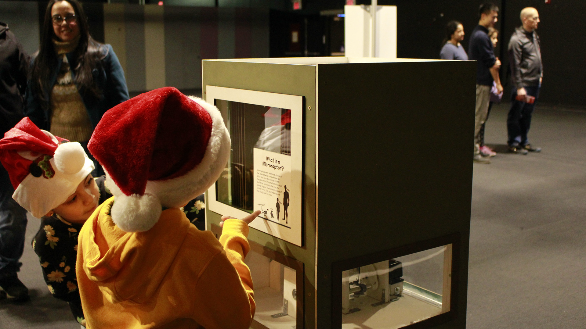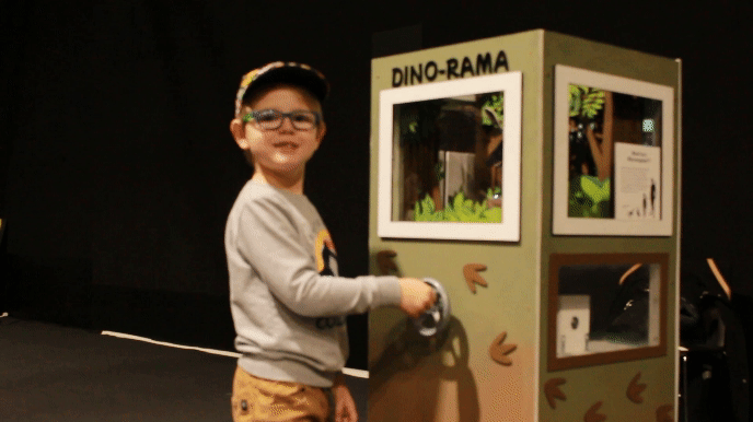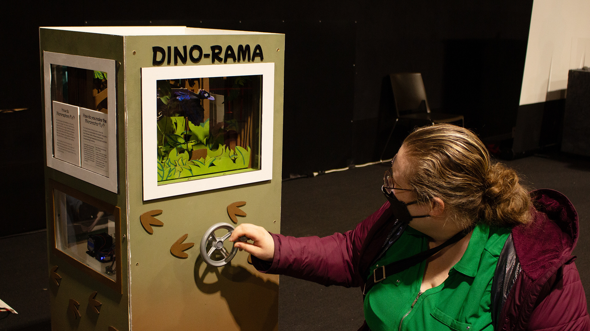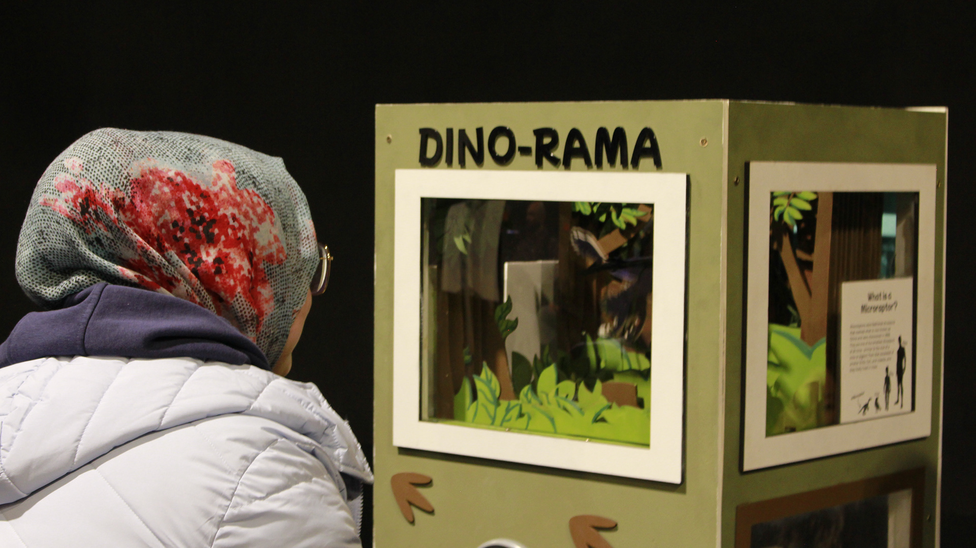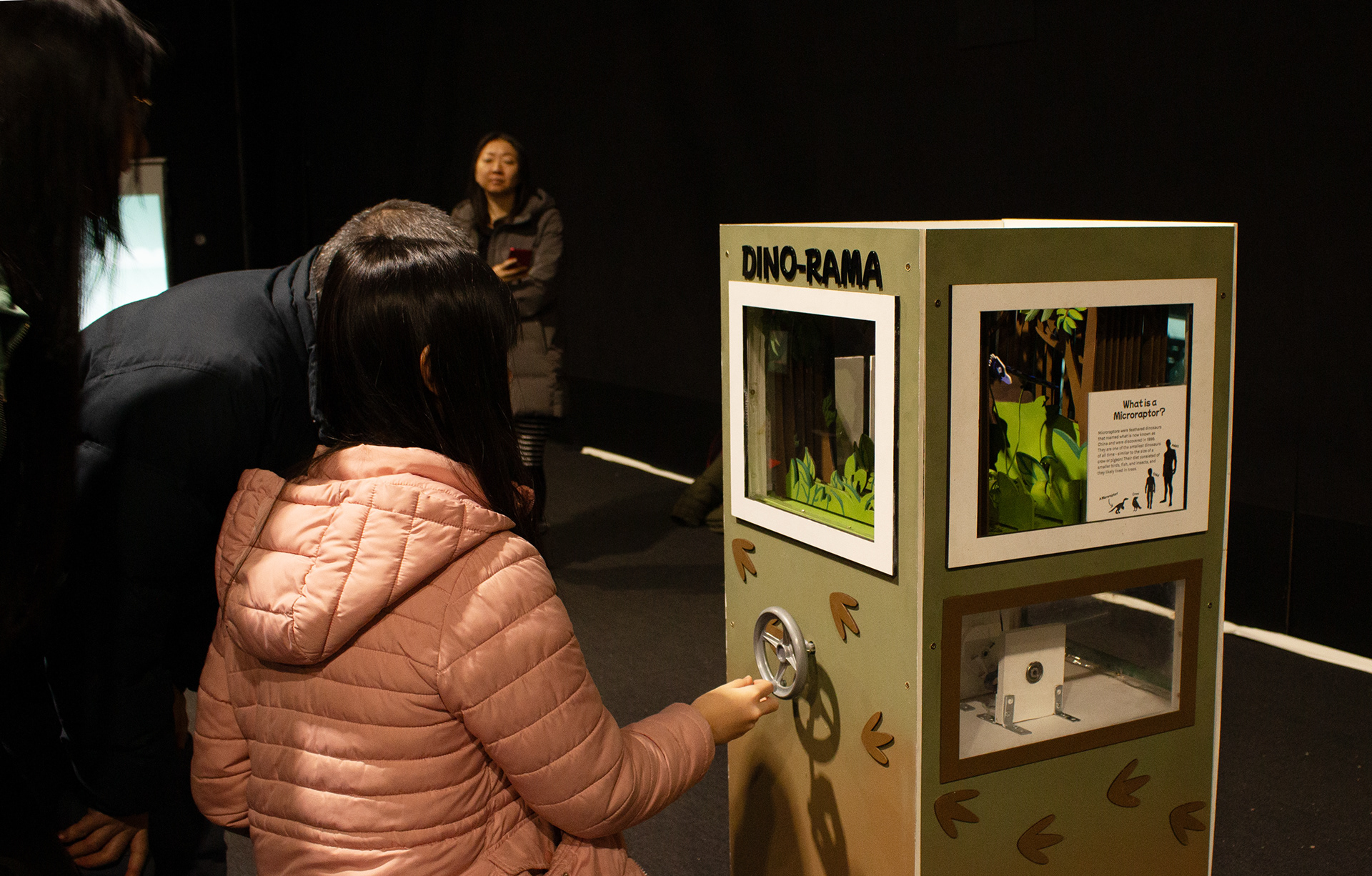 “Dino-Rama” was a weekend-long installation in the Ontario Science Centre and ran from December 8th-10th. Created in RTA830 (Co-Lab), Chau Nguyen, Angelina Almanza, Vicky Huang, Berra Sertkan, and I created an exhibition in light of the theme “Dinos in Motion” “Dino-Rama” is an immersive exhibit created by Team Egg, featuring an illustrated Microraptor in its presumed natural habitat. The display box showcases three main components: the artistic environment, the engineering marvel of Microraptor’s movement using scotch yoke and cam follower systems, and informative text boxes detailing Microraptor characteristics, flight mechanics, and the illusion of flight. This exhibit is engaging and educational, designed to captivate audiences of all ages, enhance understanding of Microraptors, and introduce STEM concepts to kids in easy-to-understand ways.