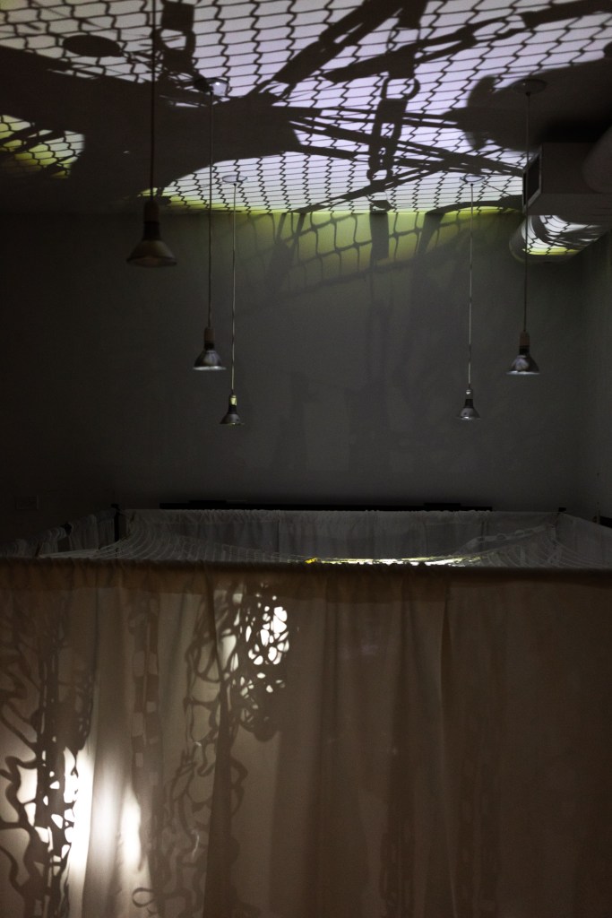 I invited the audience to come into the space and explore this ecosystem, playing with the light using flashlights and physically changing what they see around them. Move things around, tie chains up, rip the paper structures.